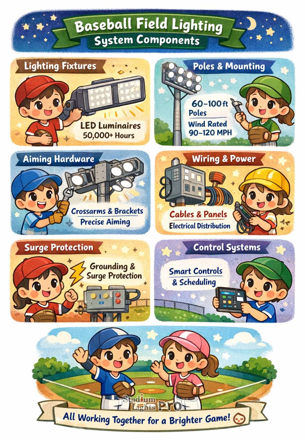 A baseball field lighting system is a bit like a well-coached team. Each part has its own role, and everything works better when those parts are designed to play together. While the fixtures are the most noticeable element, they’re only one piece of a complete lighting ecosystem that keeps the field bright, safe, and reliable night after night. On a typical baseball field, this system may include 20 to 60 fixtures, multiple poles, hundreds of feet of wiring, and control equipment working in sync.