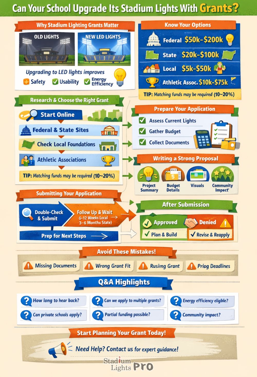 If you receive partial funding, you can phase the project. For example, start by upgrading the sections of the stadium that are most used for night games or practices, or replace older bulbs with energy-efficient LEDs first. Partial funding can also allow you to cover permits, wiring, or planning costs, which makes your project more ready for additional funding later.