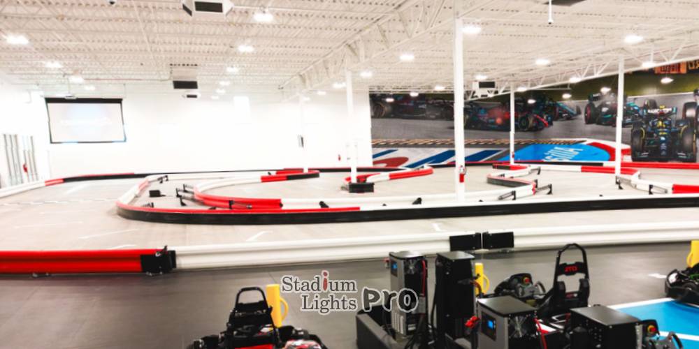 Indoor race tracks and outdoor circuits require completely different lighting philosophies. Indoor go-kart tracks usually need lower light levels—around 200 to 500 lux—since racers are driving at slower speeds and within smaller spaces. The goal is a bright, uniform field with soft shadows that help with depth perception. Reflective surfaces like polished floors or barriers often require low-glare diffusers to stop light from bouncing back into drivers’ eyes.
